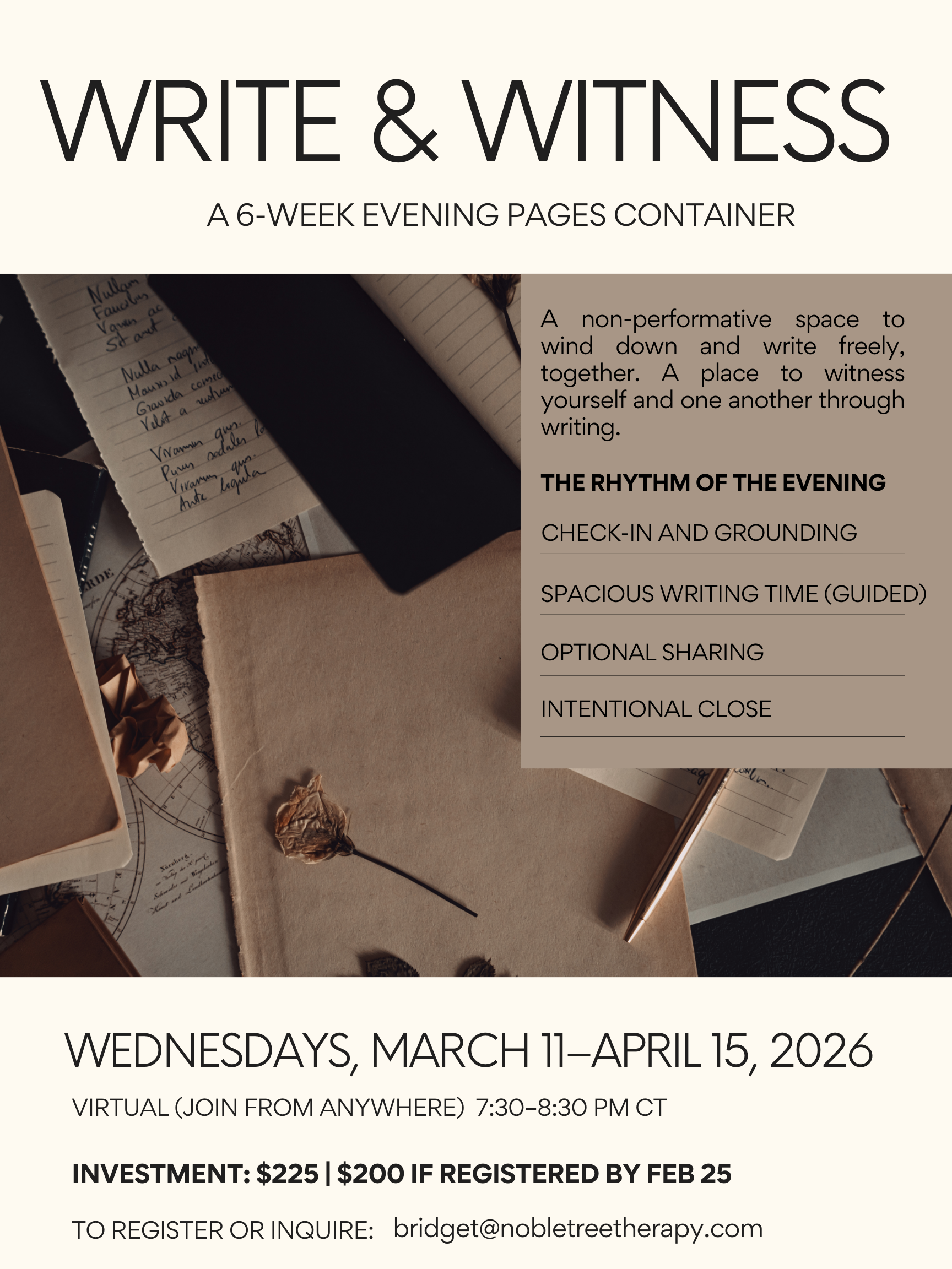 To reserve your spot, email bridget@nobletreetherapy.com.